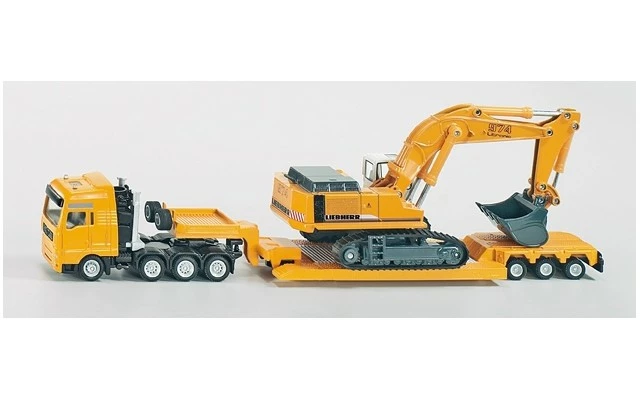 Die cast heavy haulage transporter with flat bed trailer and a Lieherr 974 Litronic excavator part of the SIKU super series collection.