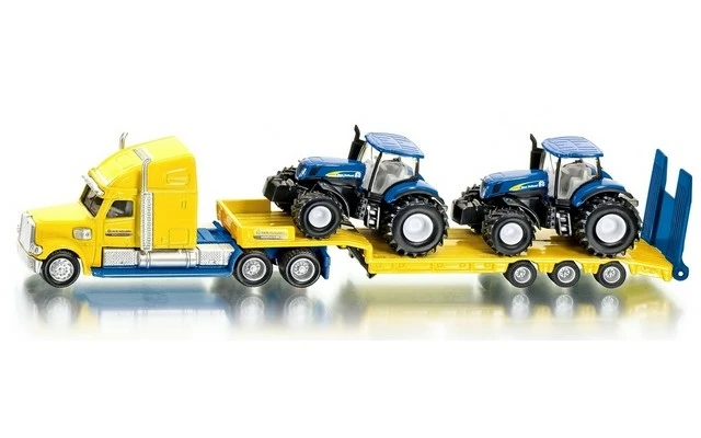 The chunky US truck featuring the world-famous New Holland tractor brand design has no problems towing two large tractors from the T8 series. Mainly produced in die-cast metal, the models are kept in typical New Holland blue and yellow colours. Tractors’ cabins are removable. All vehicles with rubber track and original detail wheel rims.