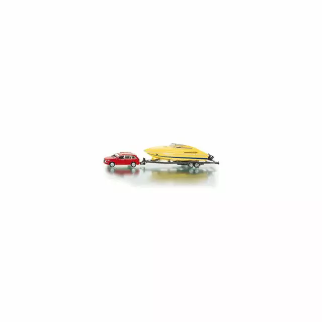 This speedy Siku set includes a trailer with a bright yellow speedboat, pulled by an exquisite model of a red Audi Q7 – all with moving parts! The boat, trailer and car can all be separated, and the back hatch of the boat and front doors of the Audi open so you can access the detailed interiors! All Siku models are built tough and built to last through hours of play. They look realistic and include many moving parts to please both a child while playing, as well as the avid collector. All Siku models are made of quality die-cast metal with plastic parts. The model scale is 1:55.
