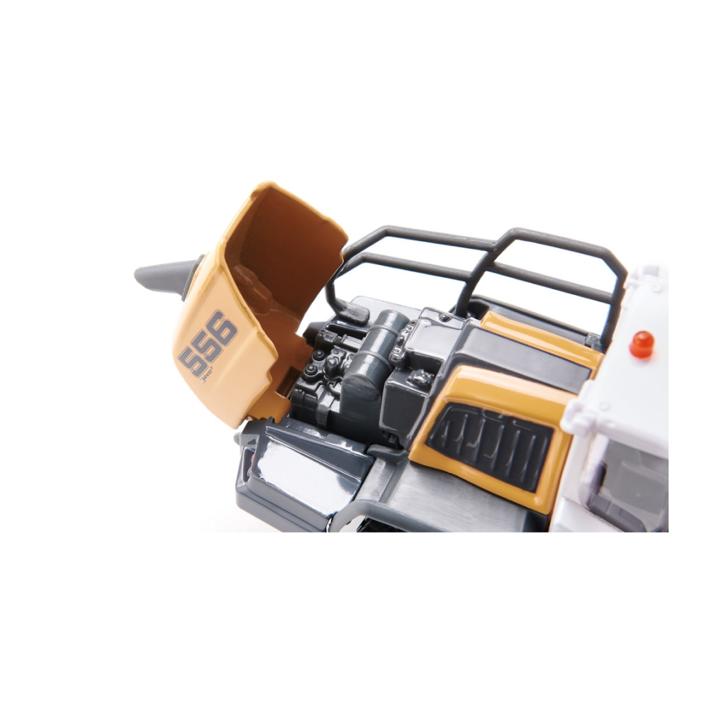 All-rounder on the construction site – Wheel loaders are all rounders. The articulated loader is at work on the construction site, for road building, in mixing plants, in quarries, and in tunnel building. The Liebherr L 556 is particularly powerful, efficient, and versatile. The front loader with the huge shovel can be moved up and down, and has the power to clear things out of the way. The wheel loader in Liebherr design runs on rubberised tyres. A powerful, economical engine growls under the huge bonnet, which can be opened.