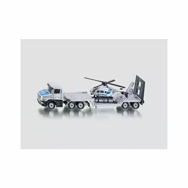 Made almost entirely of durable die-cast metal and plastic, this Siku low loader with police helicopter is ready for any rescue! Built to remain strong during rough play and painted a lustrous grey with blue and black accents, it also includes a fold down ramp and rotating helicopter blades. Realistic enough to please a child during playtime as well as the avid collector!
