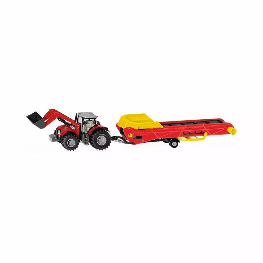 With the front loader and the huge shovel, the Massey Ferguson tractor already has an imposing appearance. The front loader is height-adjustable, and the shovel’s tipping angle can be modified. A large conveyor belt with towbar is attached to the trailer coupling. The conveyor belt is height-adjustable and has a mechanical rotary drive, and so the professional loaders can convey the material.