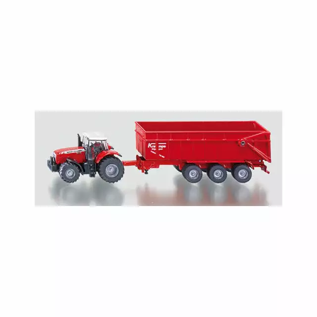 The Siku Massey Ferguson Tractor with Trailer Scale Model is an attractive addition to your Siku collection! It features true-to-scale original wheel rims with rubber tracks. This model has a removable cover, front loader and trailer decoupler. It is complemented with a highly detailed front loader with tipper. Top quality manufactuing and detail make this toy perfect for creating a realistic experience for children and collectors alike.