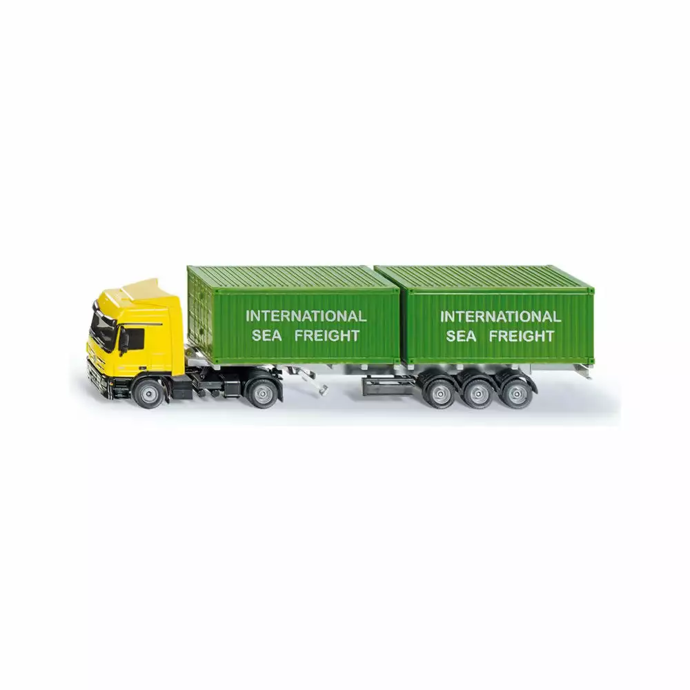 Products of all types are transported across the world using shipping containers. By road, the containers are transported using trucks with special semi-trailers. For great playroom enjoyment, SIKU is implementing this theme with the new Mercedes-Actros transport combination with 2 containers. The length of the variable semi-trailer can be modified, according to whether it is loaded with one or two containers. If only one container is transported, the rear part of the semi-trailer frame can be pushed in so that the container can be located in the middle of the semi-trailer, for optimum weight distribution. The containers are equipped with movable doors which allow convenient loading and unloading.
