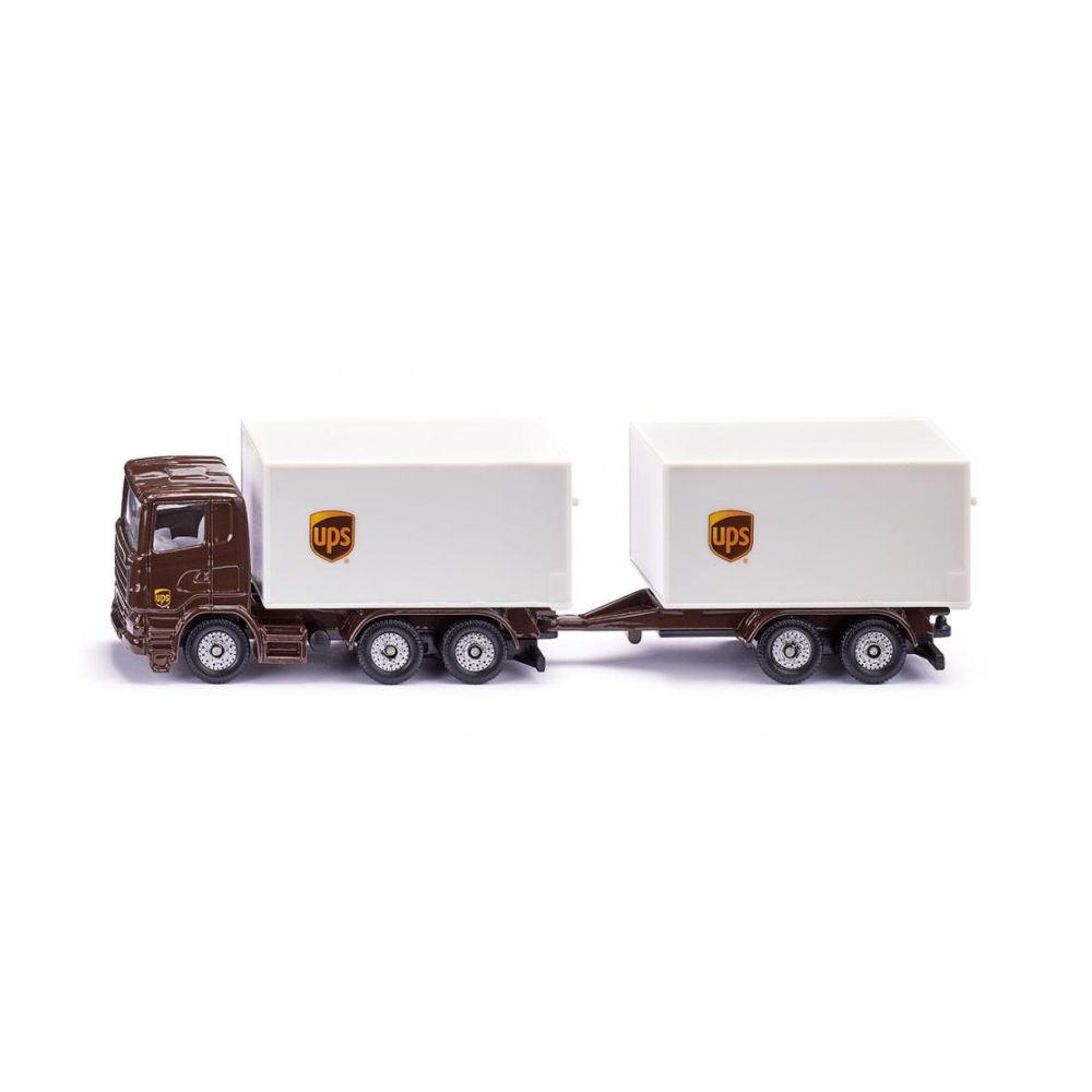 The set consists of a forklift truck, a 3-axle tractor unit and a delivery van in the typical UPS colour scheme.